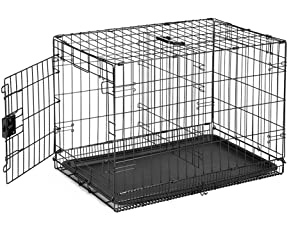 The Amazon Basics metal dog crate features a single front door design for easy entry/exit; ideal for crate training and secure containment for pets.