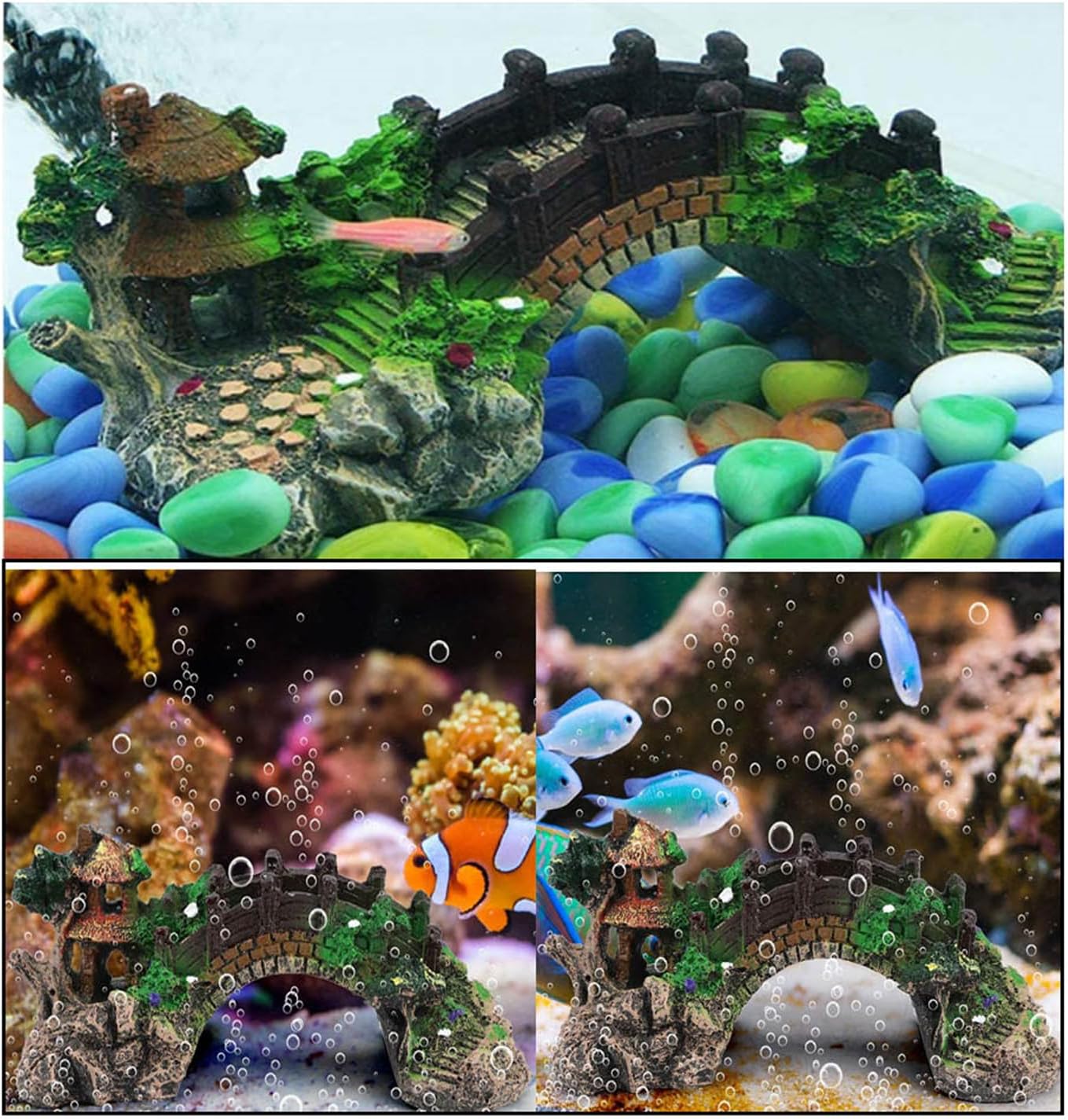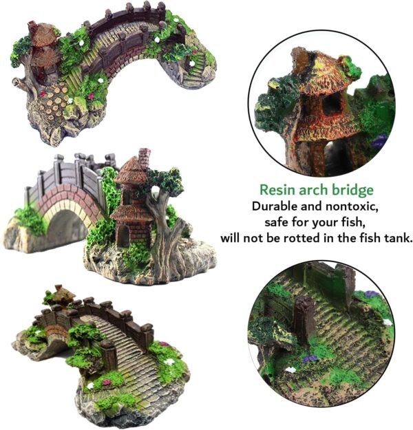 Wide Applications: High quality ornament set for all freshwater and salt water aquariums. Arch bridge can also be placed in an outdoor small landscape. Plastic plants can also be used as accessories in fairy garden. The set can be as a gift for lover, family member or friends who have a fish tank, especially who also like DIY and home decorating. Change your aquarium into a beautiful scenery.