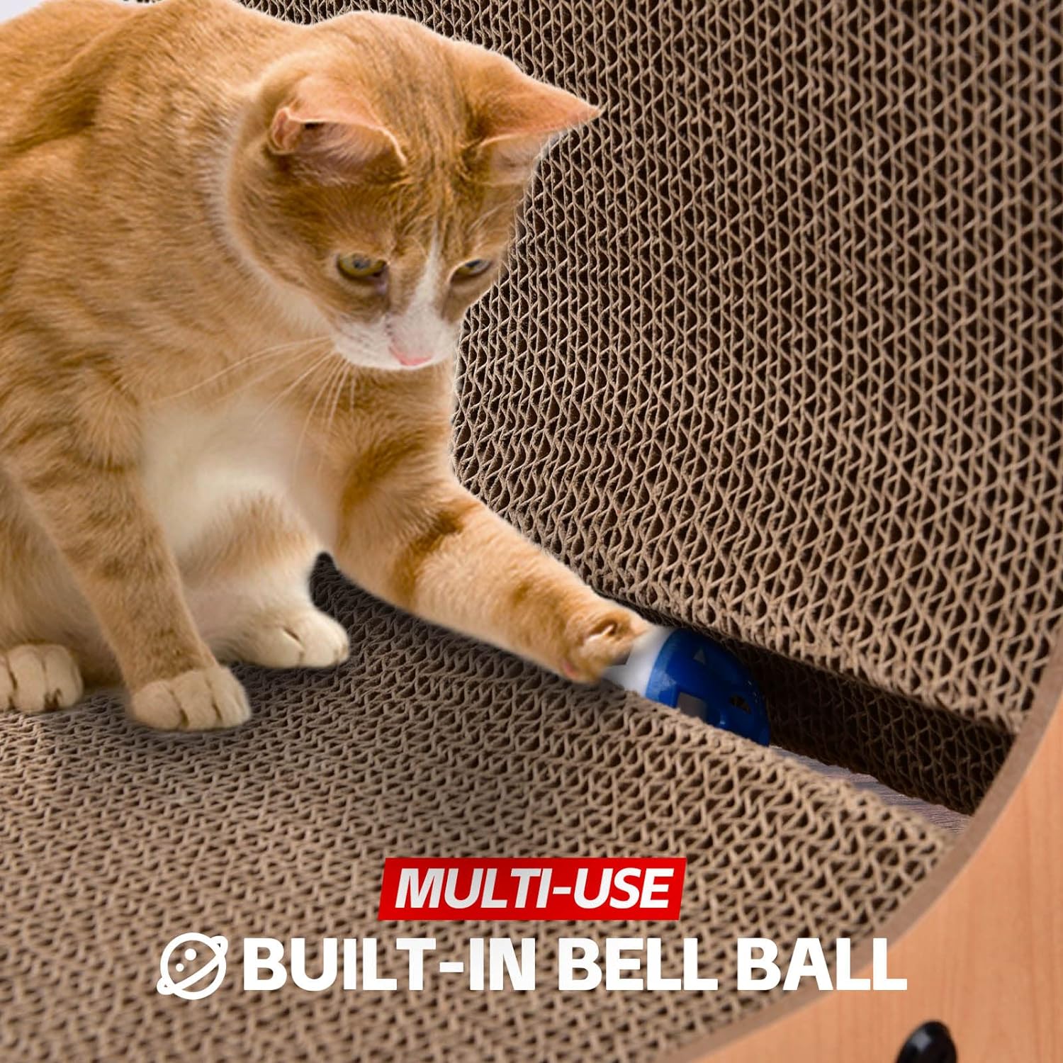 ?【Build-in Balls】: The cat scratch pad has two built-in cat toy balls(catnip ball and bell ball) to inspire your cat to chase and play, greatly improves the fun of cat scratch. The balls are all attached to each track, no need to worry about cats accidentally eats them and allows cats to push the ball back and forth freely.