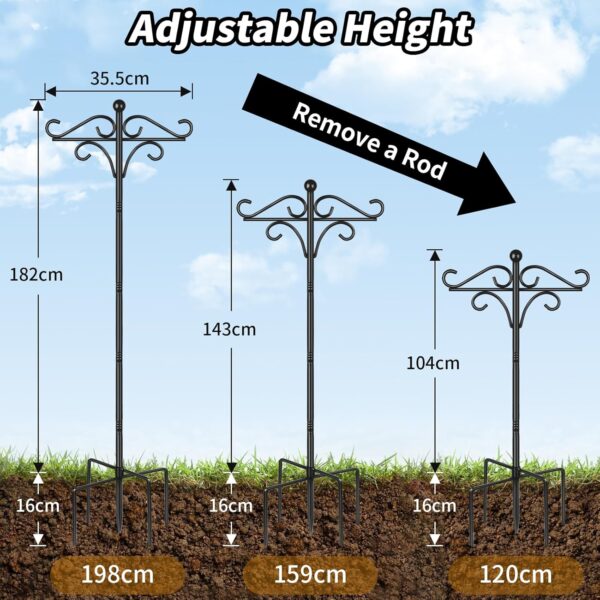 Customized Size — garden crook hooks is available in 198CM, 159CM, 120CM, and 81CM, the choice is yours! This plant hanging pole set includes 1 x Stylish Double-Arm Design hook, 3 x extenders, and 1 x upgraded 5-prong base. adjustable height provides flexibility for your preferences. Please note: 198CM (overall height)=182CM (above ground) + 16CM(under ground)