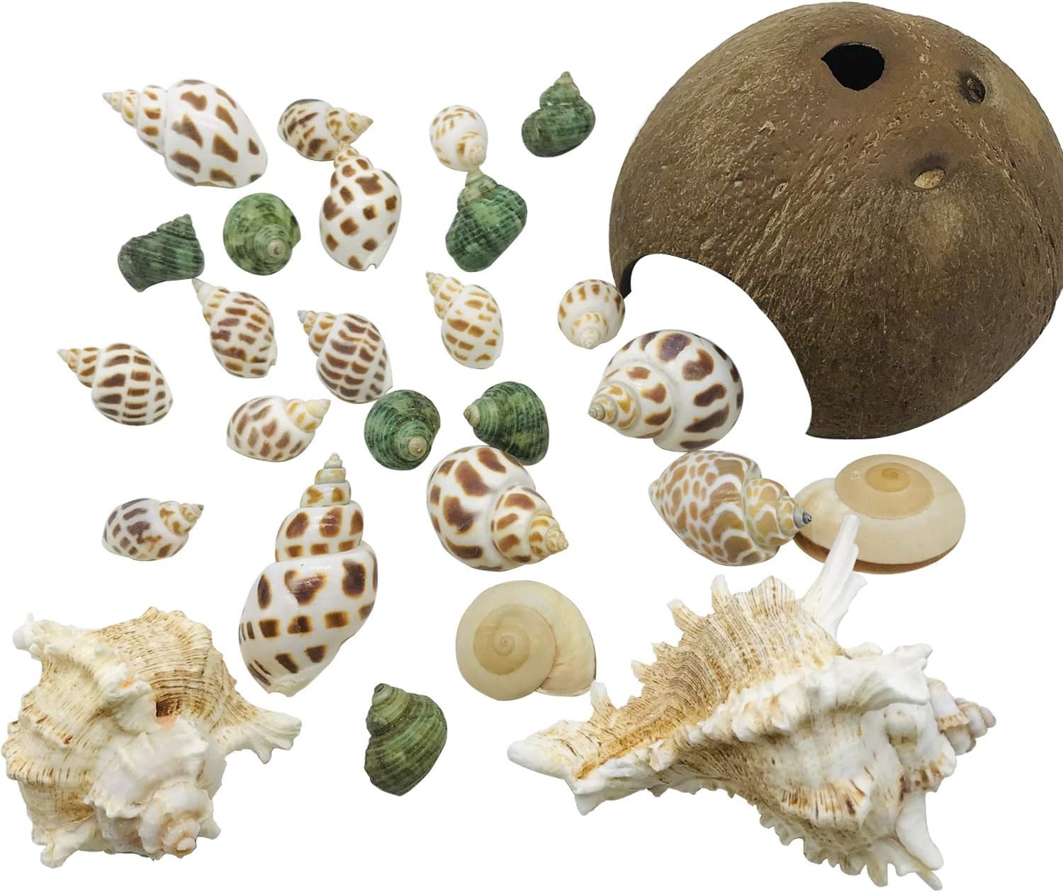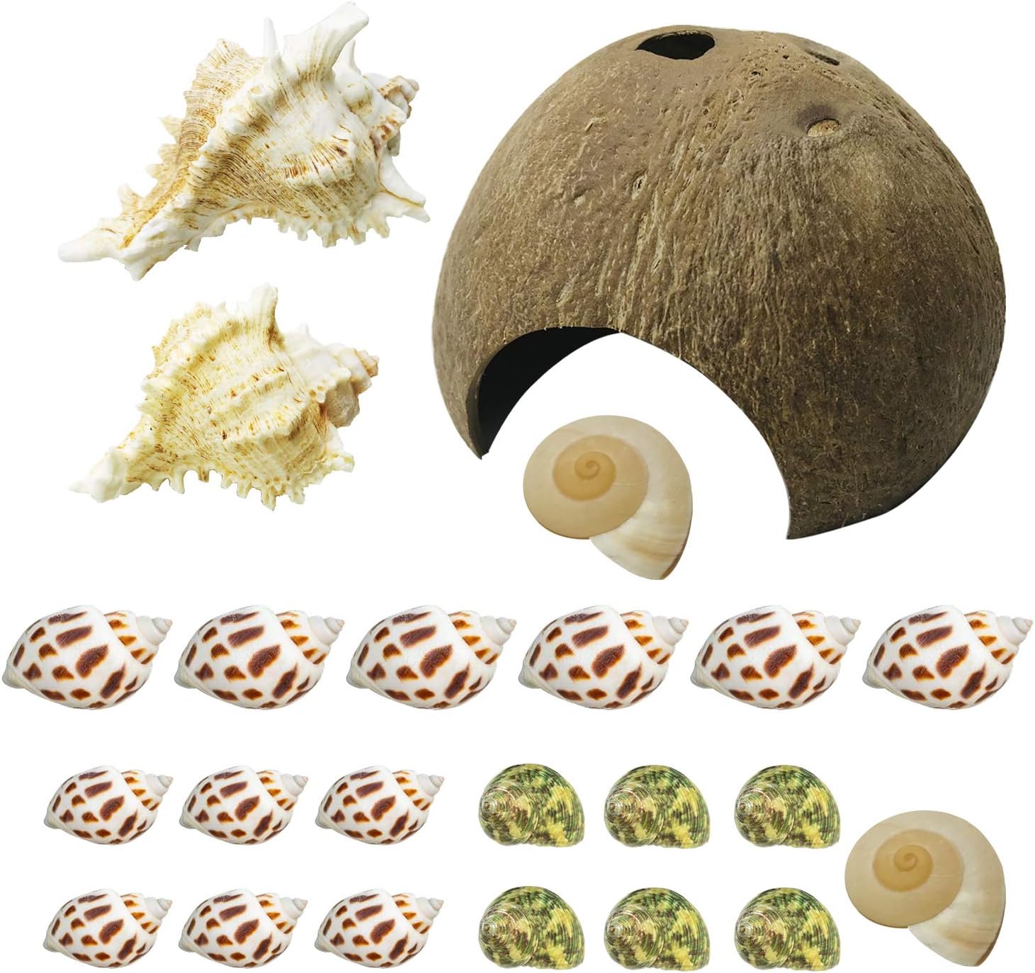 Package includes: 1 PCS coconuts and 22 PCS shells in different types. Hermit crab shells come in a variety of sizes (as the picture shows), which makes it perfect for a growing hermit crab. Note: Our shells and coconuts are natural, the size, shape and color of each batch may be slightly different, please make sure you do not mind before you order.