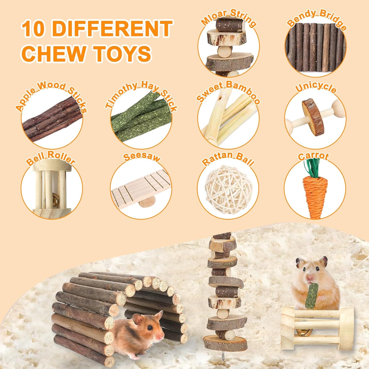 DIVERSE AND FUN VARIETY: Our 10 Pcs hamster chew toys set includes a hamster hideout, molar string, bell roller, seesaw, unicycle, woven ball, woven carrot, sweet bamboo sticks, applewood sticks, and timothy hay sticks. These carefully crafted toys provide a wide range of activities for your furry friends, keeping them entertained and engaged.