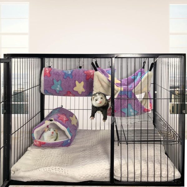 Spacious Size: The double-layer hammock dimensions 13.8*13.8 inches , ultra-soft plush tunnel dimensions 7*18.5 inches, and warm sleeping tent all have dimensions of 7.9*9 inches, providing ample space for your ferret to stretch and move around freely.