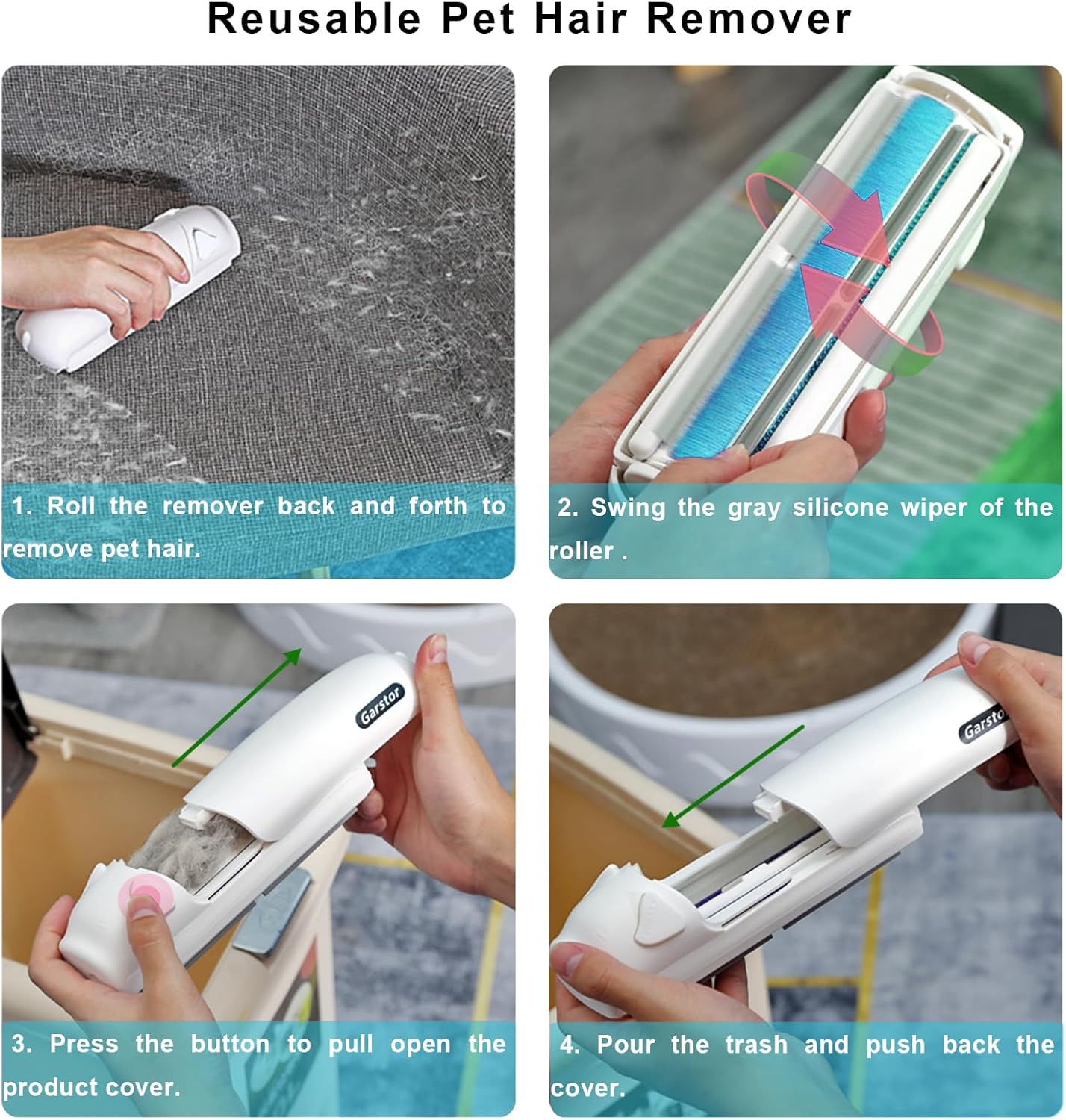 3.【Easy to Use & Self-Cleaning】Just roll the hair remover back and forth several times, to catch the fur in the container, then press the button to empty all the pet hair and lint,which saves you the trouble of touching and picking up the accumulated waste with your hands. No need to wash with water.