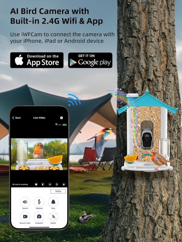 [Stable 2.4Gwifi Connection] The smart bird feeder has a built-in 2.4Gwifi, the recommended distance for wifi coverage is 10 meters. You can download the “iWFCam” APP through Apple or Android system, and bind the bird camera on the APP, you can check the bird video on your phone anytime and anywhere, and watch the bird activities in real time; this smart bird feeder supports multi-device online viewing, and you can share it with your family and friends to get close to nature together.
