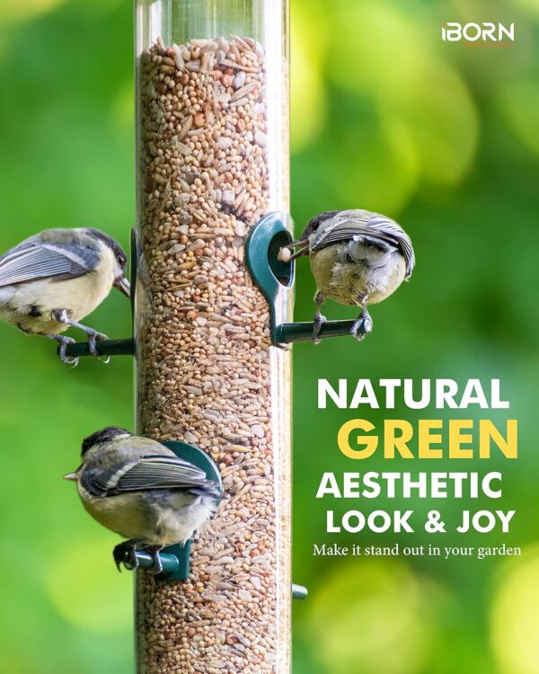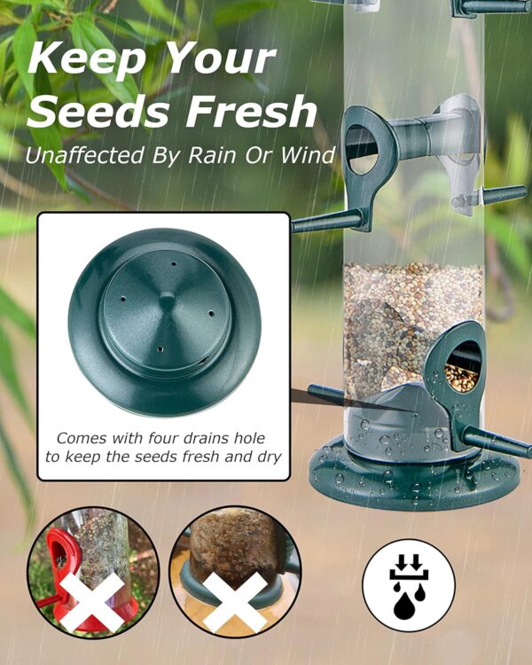 【Green Power Coated,No Color Fading, Great for all the year round feeding】Wear and Worn, Never Rust. All Metal top, base, feeding ports, perches, green power-coat,rust resistant, robust construction to sustain all weather days. It features royal-stylistic green outlook, traditional design inviting more feather birds to your garden, add more liveness to your garden life.