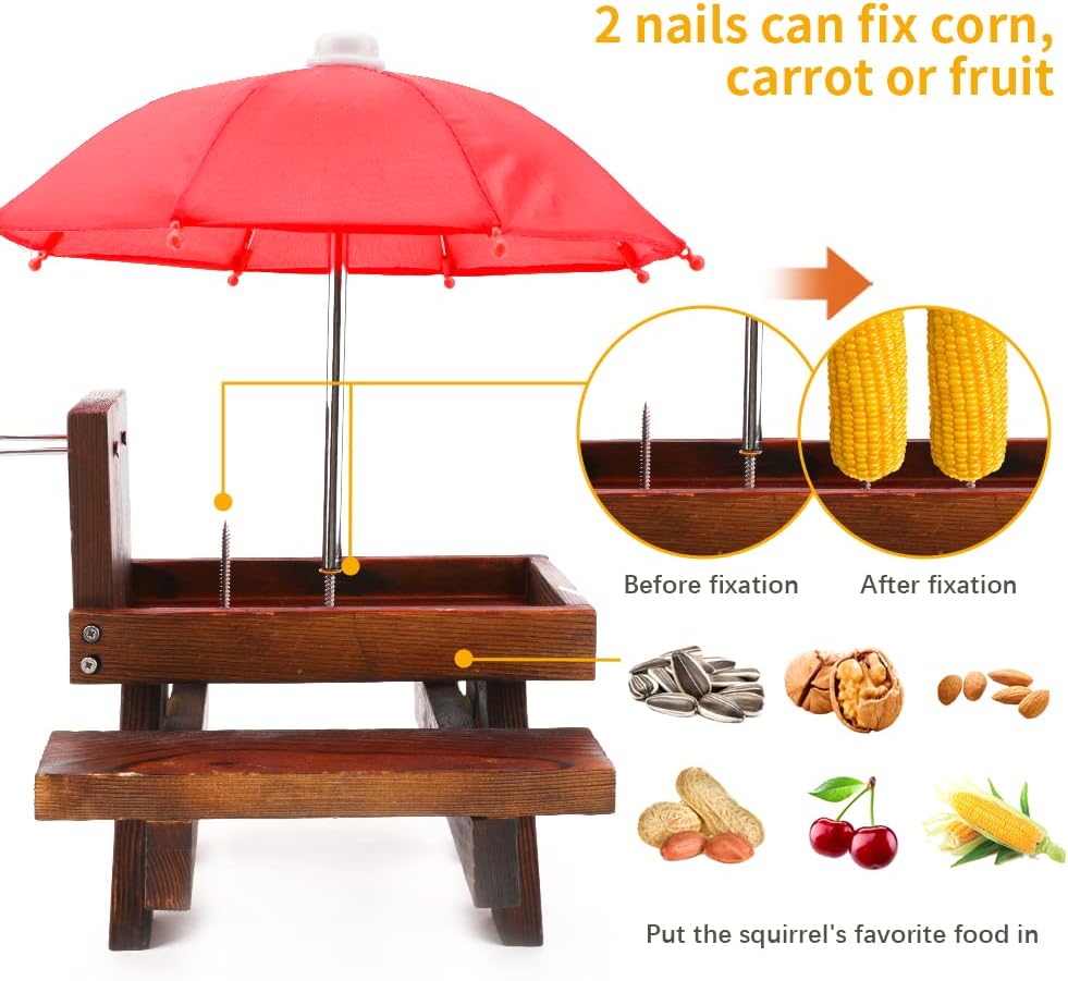 icyant Squirrel Feeder for Outside Funny, Wooden Squirrel Feeder Picnic Tabler with Umbrella and Corn Rack, Cute Chipmunk Feeder – Includes Mount Screws
