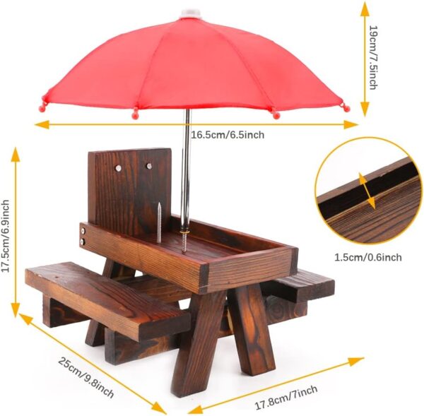 【Unique Design】The wooden squirrel feeder table comes with a bench and a red umbrella, the squirrel feeder stations bench is firm and won’t wobble, so the squirrels can enjoy their food better, and the umbrella makes the squirrels more comfortable and the lining does not get wet when it rains. And there is a drain hole at the bottom, which is not easy to accumulate waterter.