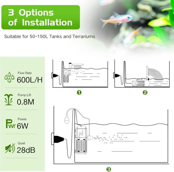 【Powerful Tank Filter】600L/H large water flow which can further improve aquarium environment and increase the ornamental value of your fish tank.