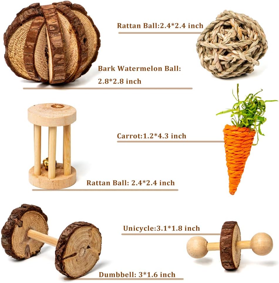 ?【11 Models of Wooden Chew Toys】- The Hamster Chew Toys Kit includes Watermelon Balls, Bell Roller, Dumbbell, Unicycle, Square Molar Block with Rope, Bell Swing, Climbing Ladder, Carrot, Willow Rattan Ball, Seesaw and Molar String. Note: Like most similar products on Amazon, some of the accessories come with metal, but unlike other products on Amazon, these only few metal parts have been modified and we have polished the edges of the metal parts to make it safe enough for your pet to use.