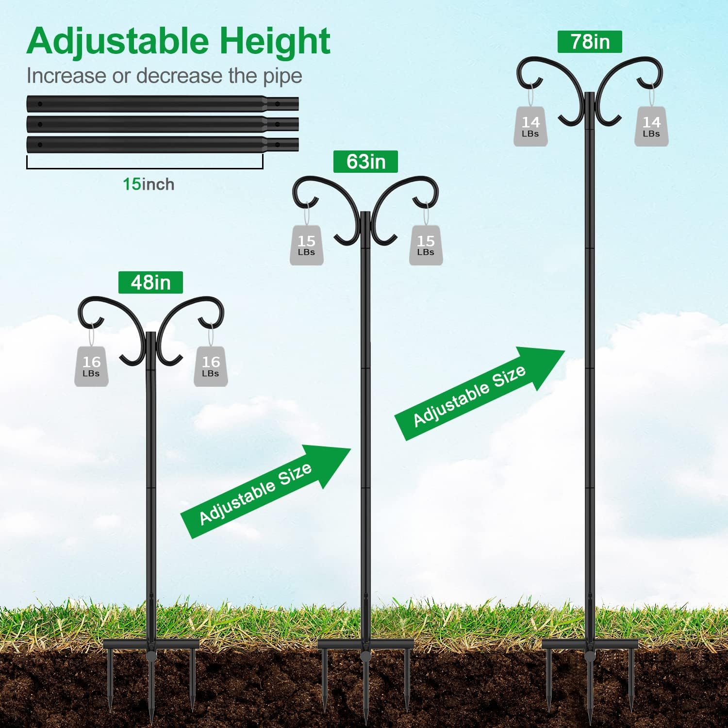 Stable and Durable – This adjustable shepherd hooks is made of high-quality iron with a black powder-coated surface, providing rust and weather resistance, making it perfect for outdoor use. The shepherd hook has a tubular design that increases strength and prevents bending.