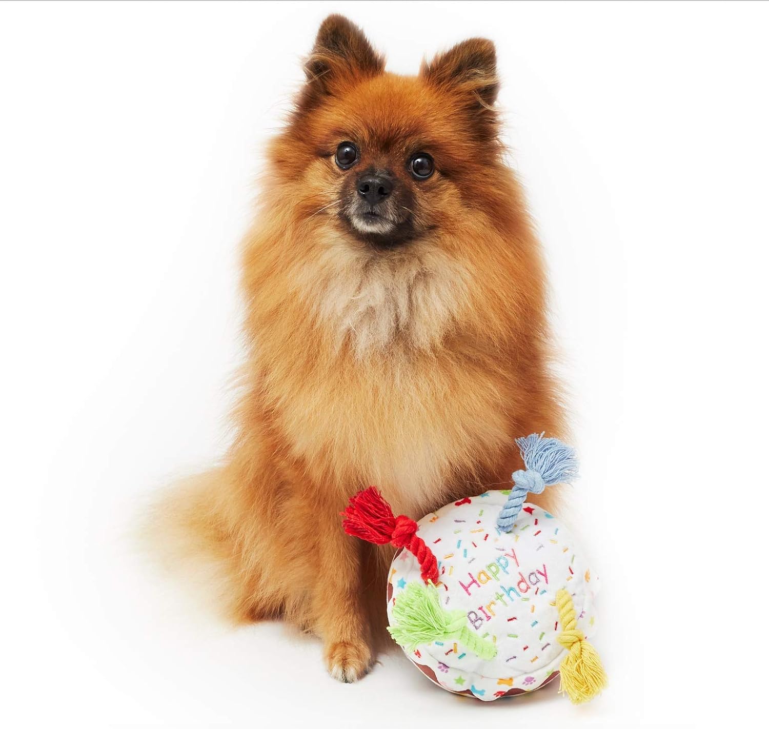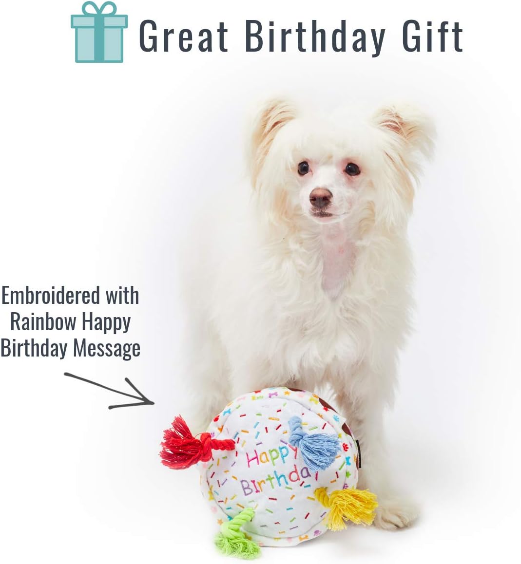 DOG BIRTHDAY FUN! -Soft plush cake pet toy for birthday parties or celebrations-plush design easy for your pet to pick up and hold by the main body or by the four tantalising rainbow rope ‘candles’ that can also provide dental flossing action.