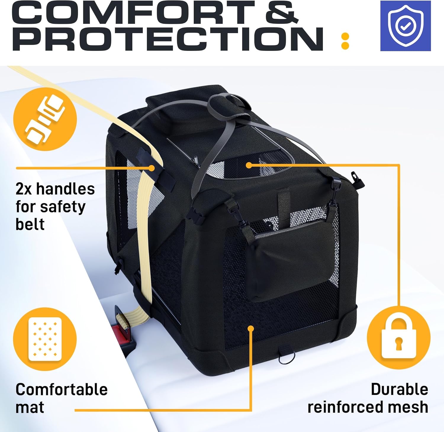 Ideal solution for travels and home usage – with PetProved pet carrier forget frustrating travels with your furry friend! The car dog crate provides a safe and comfortable space for your pet, and as for you, it is easy to carry, install in the car/train and simply use it at home as a kennel. PetProved versatile dog travel crate for car can be yours now!