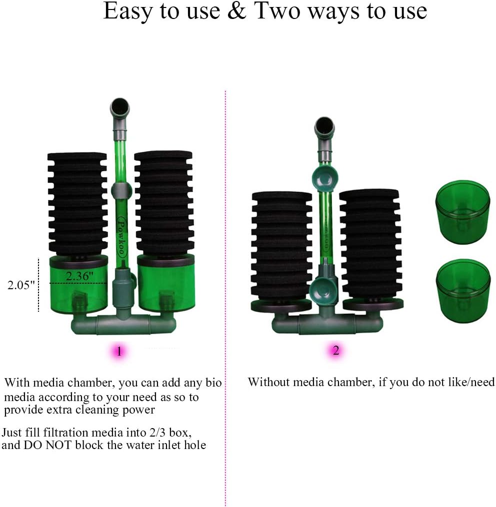【Fit fish tank size: 30 to 200 litre】it has 2 chambers for extra bio media so to you can add any filter media as your need, increases biological filtration, having different varieties of media really makes a big difference with water parameters and clarity, comes with 2 suction cups, you can stick the filter firmly to any tank position under water, no floating. what you get: 1 x Powkoo aquarium sponge filter, 1 bag x 150g Powkoo 2 in 1 bio media, 1 x Powkoo retail package bag