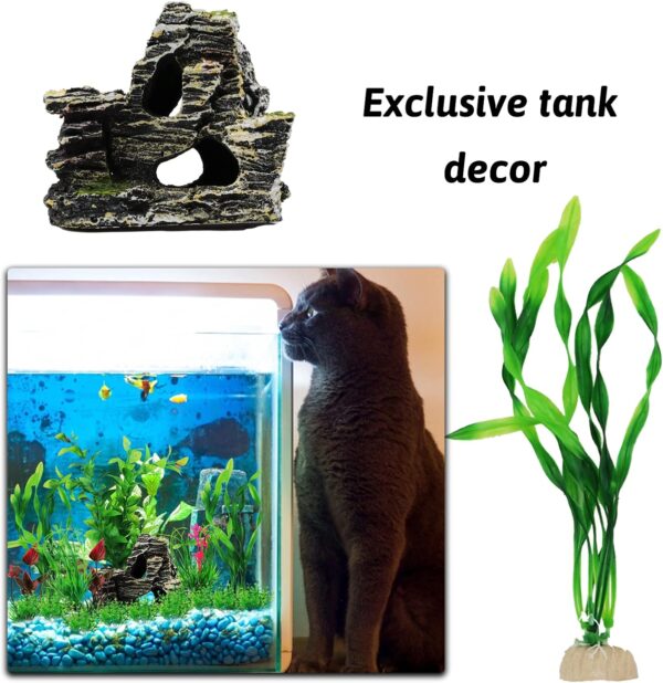 Green Fish Tank Accessories: 1 pieces Resin rockery Aquarium Decorations and 19 Pieces assorted Heights aquarium plants: (2 – 4.9 inch and 2 large plants: 8.5inch, green and red ).