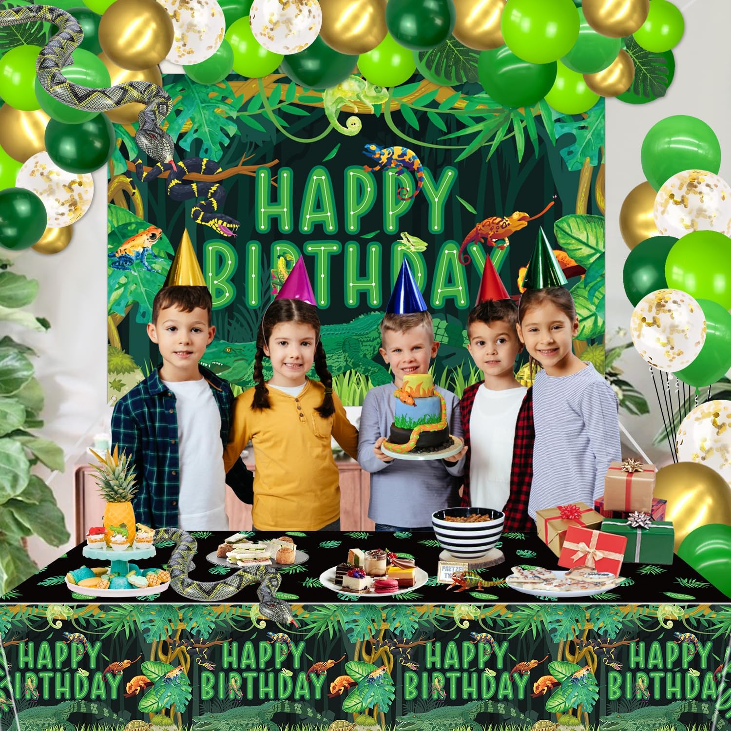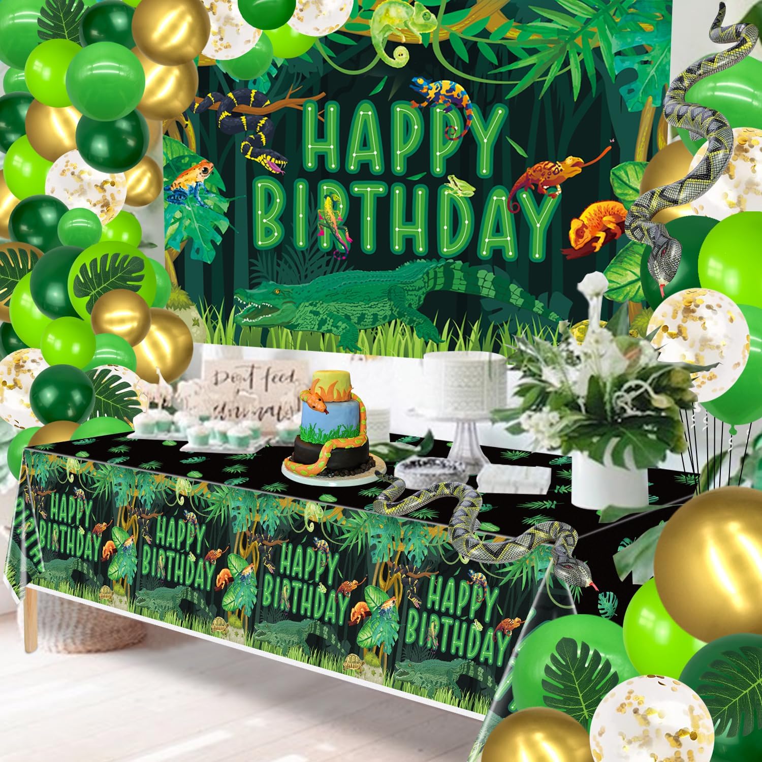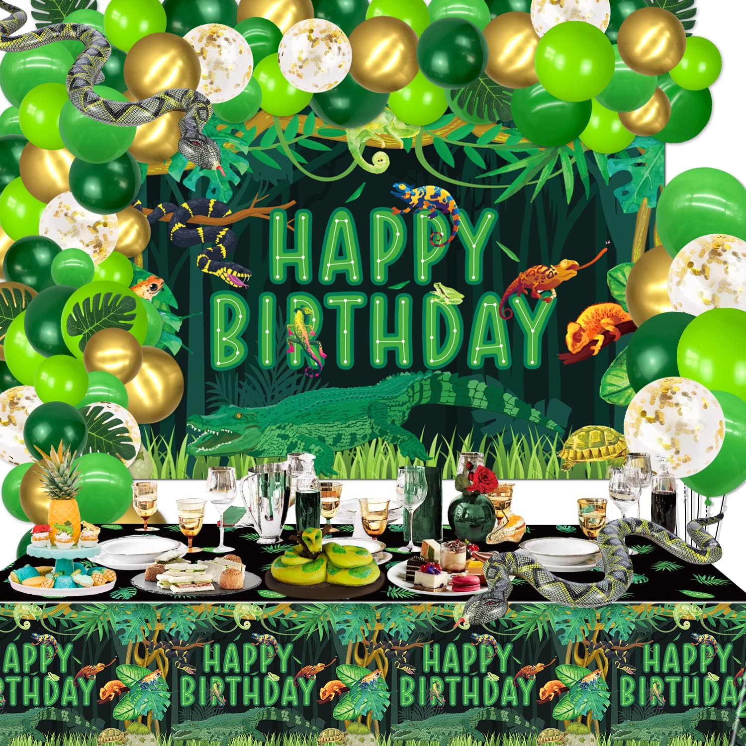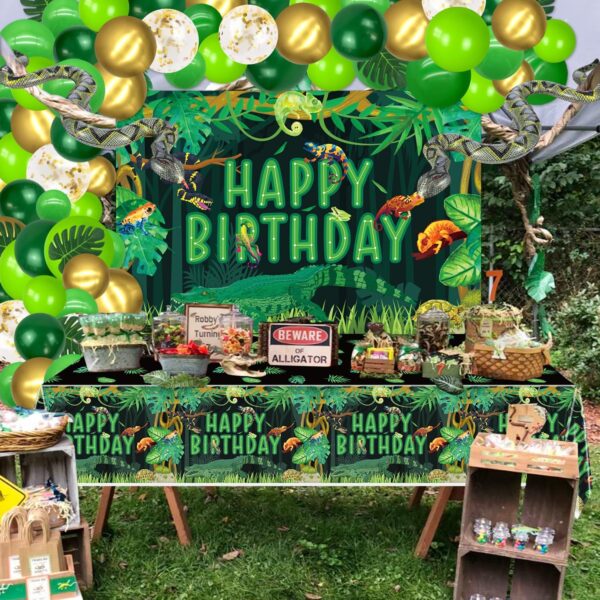 Reptile Birthday Party Supplies, Includes Happy Birthday Backdrop, Tablecloth, Balloons, Jungle Swamp Wilderness Snakes Lizard Alligator Turtle Birthday Decorations for Kids Boys Birthday Party Decor