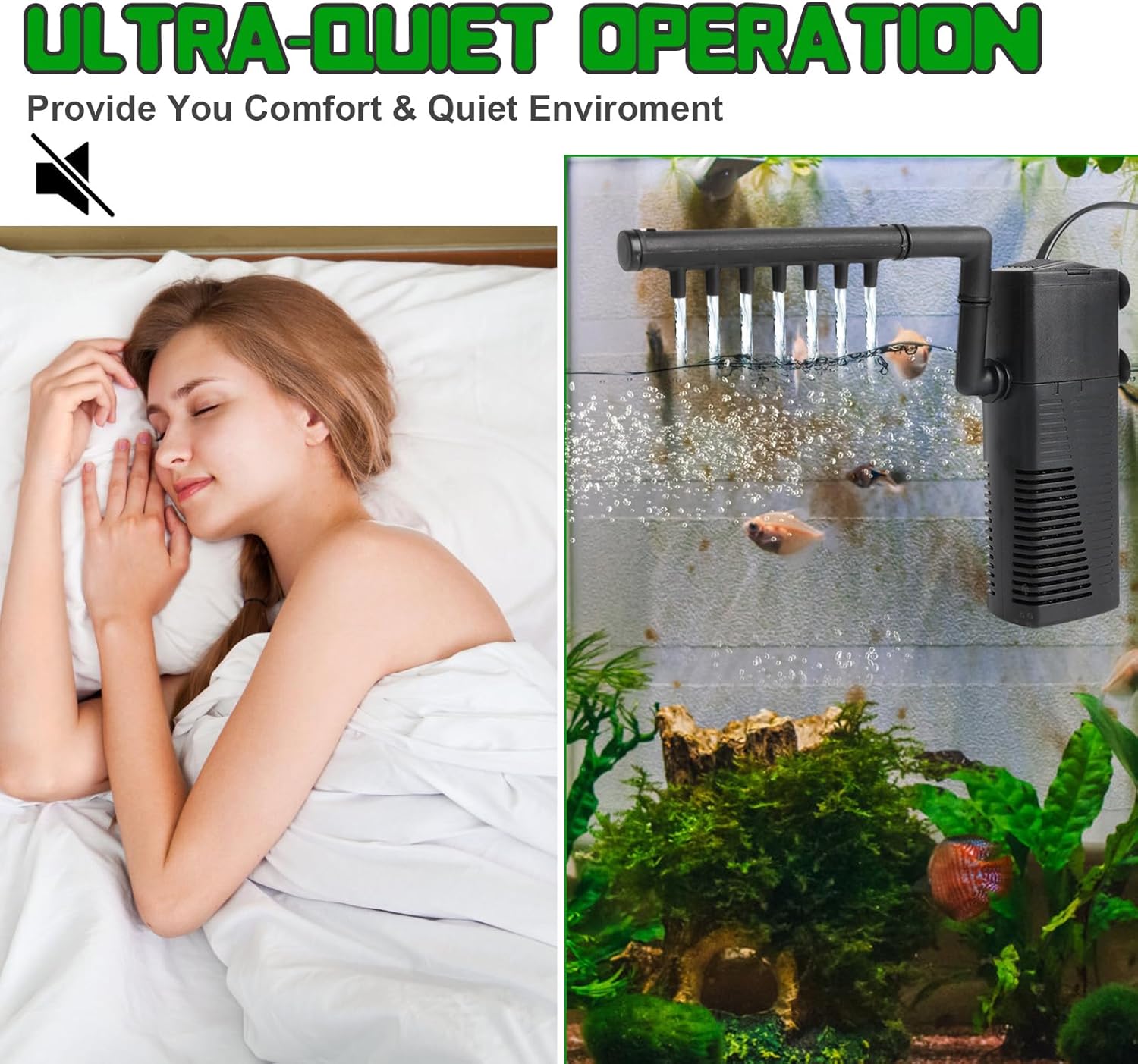 Ultra-Quiet Operation:The fish tank filter operates silently to give your bedroom a quiet environment. 4 sturdy suction cups can be mounted vertically and horizontally on glass surfaces.