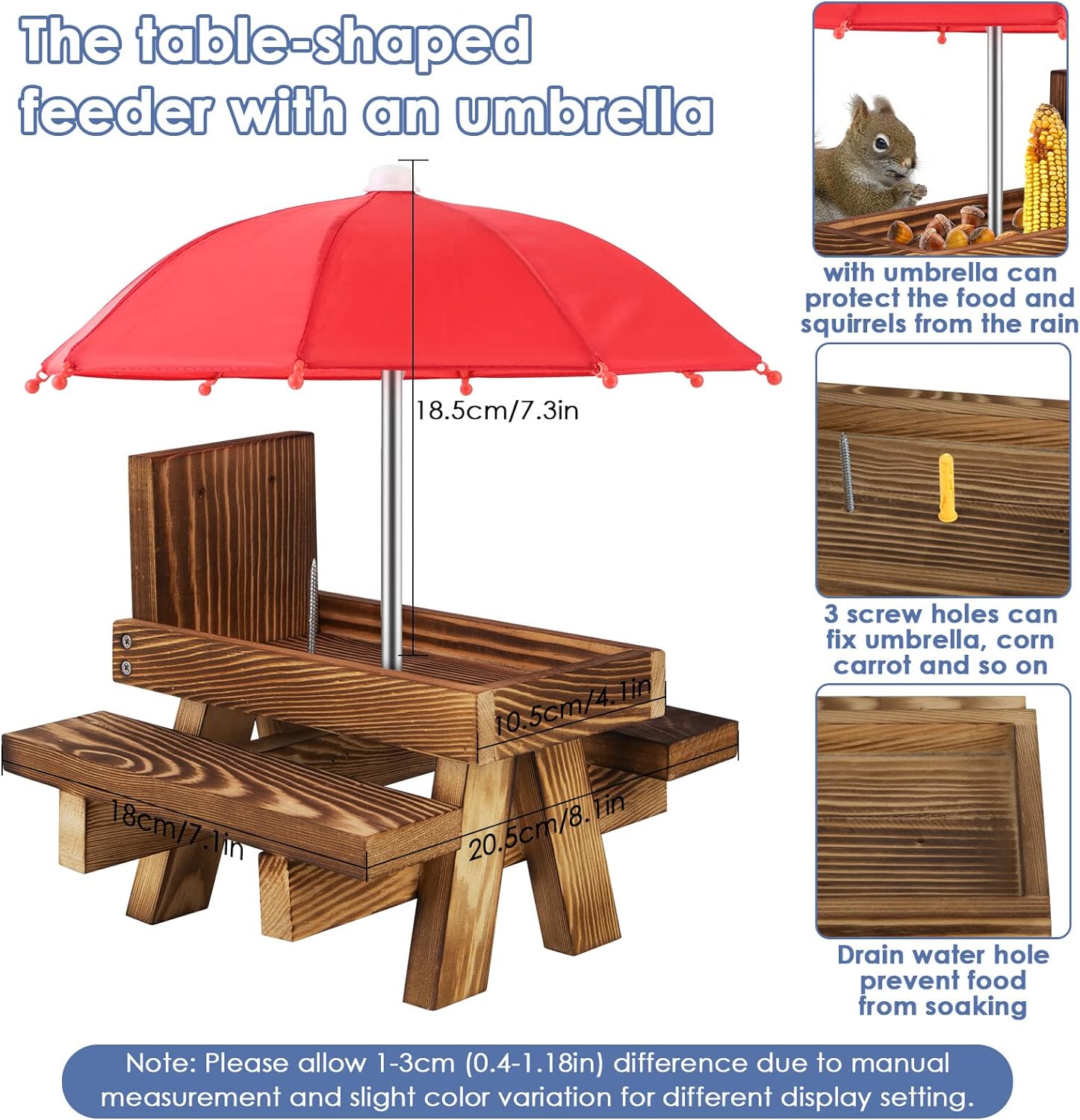 【Squirrel Feeder Funny】Comes with the finest red umbrella, our Squirrel Feeder Picnic Table is probably the most adorably designed, guaranteed for unlimited fun and backyard entertainment.