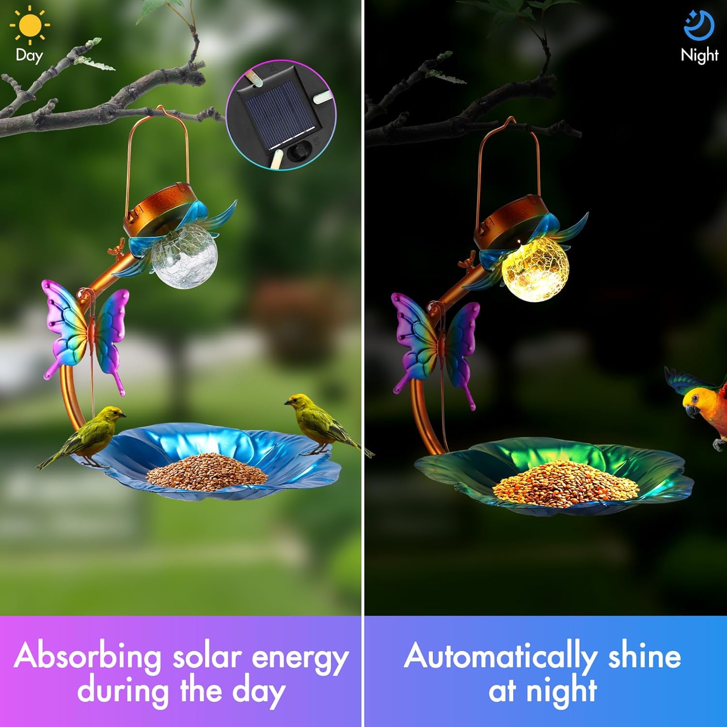 ?TWO-IN-ONE HANGING BIRD FEEDERS HANGING: Our bird feeders combine the functions of bird houses and solar lights, which not only provide a safe and comfortable dining environment for birds, but also add a natural warmth to your yard. The smart sensor design of the solar light allows it to automatically light up when it gets dark, providing direction guidance for birds while also adding a soft night light to your yard.