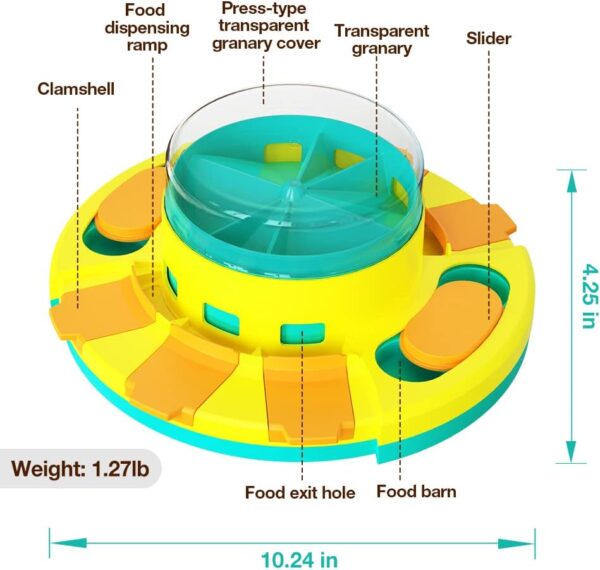 ?【Upgraded Difficulty】To upgrade the difficulty of the game, the dog needs to press the top transparent granary cover, the food in the granary will fall into the leaking food box below, and then the dog will open the leaking food box cover to eat the food. Added steps for dogs to get food and upgraded the difficulty level of toys.
