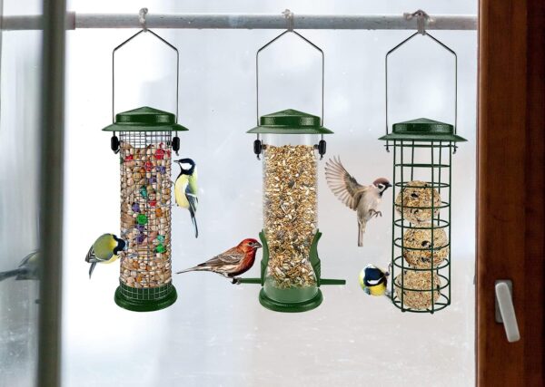 SLEEK DESIGN GARDEN BIRD FEEDERS: Fat ball bird feeder is made up of premium metal which keeps the seeds safe and secure, bird seed feeder feeding ports allows multiple birds to feed at the same time. Bird feeders for small birds can be easily refilled from top, and the mesh and plastic tubes makes them easy to monitor bird seed levels. Sunflower hearts bird feeder is compact and weather-resistant.