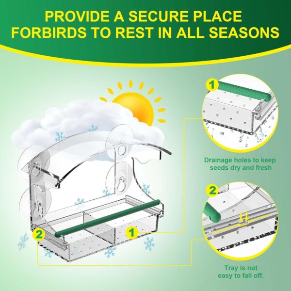 ?【 REMOVABLE BIRD SEED TRAYS】 Easy to Install and Remove: Simply attach the feeder to any window using the included suction cups, and easily detach the seed tray for hassle-free cleaning and refilling.